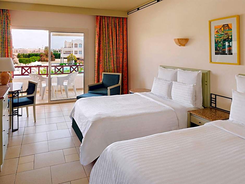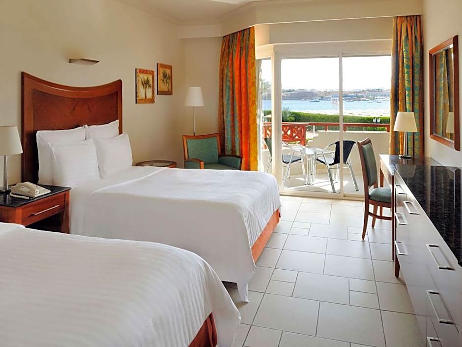 Executive Room With 2 Queen bed, Partial Sea View (Beach Side) is 409 square feet and includes a queen-size bed 150-154 width plus balcony, terrace, cable tv, hairdryer, tea and coffee making facilities , ironing set, safe, and bathrobes.